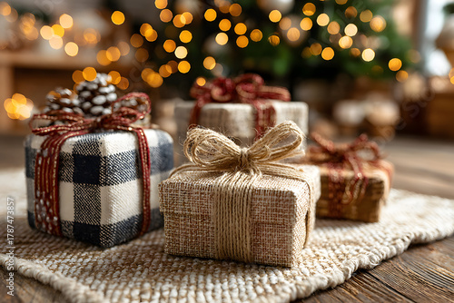 © Daniel, Obraz premium Beautiful Christmas gift boxes on floor near fir tree in room