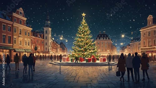Obraz premium Beautiful Christmas tree on town square. Cartoon style. Festive and...