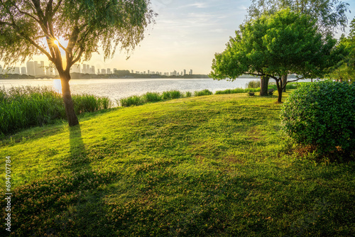 © evening_tao, Obraz premium Beautiful city park with lake, trees and mountains