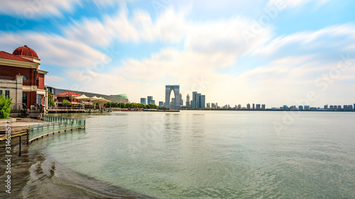 Naklejka premium Beautiful city skyline and tranquil lake in Suzhou at sunset
