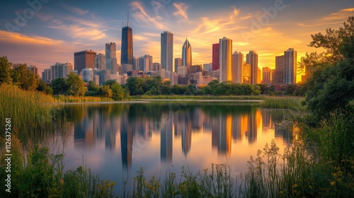 © Aashutosh Pandit, Obraz premium beautiful city skyline at sunset reflecting on calm water