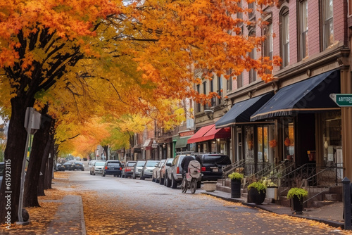 © Simonforstock, Fototapeta premium Beautiful city street with cars, houses and yellow leaves on trees in autumn season