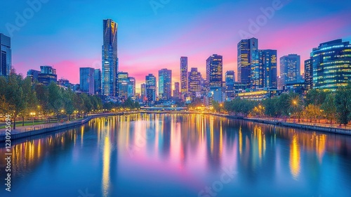 © ToMiiStock, Fototapeta premium Beautiful Cityscape at Twilight with Reflections on Water Surface