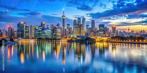 Fototapeta premium Beautiful cityscape during blue hour, blue hour, cityscape, buildings,...
