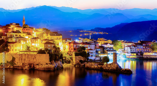 © muratart, Obraz premium Beautiful cityscape on the mountains over Black-sea at blue twilight hour - Amasra, Turkey