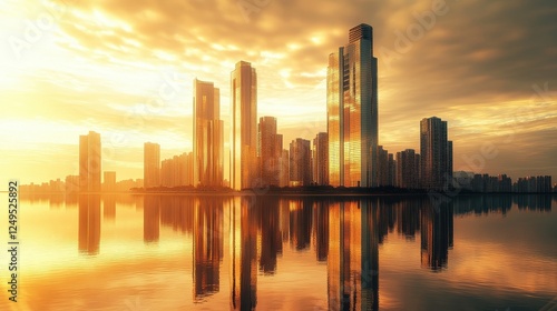 © RizArt, Fototapeta premium Beautiful cityscape reflected in calm water during a golden sunset