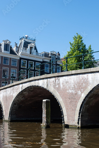 Naklejka premium Beautiful cityscape view of the city of Amsterdam as seen from the canal and bridges.