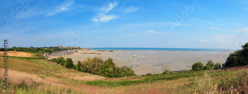 © dennisvdwater, Obraz premium Beautiful cityscape view of the skyline and beach at low tide of the city Cancale, France, in summer