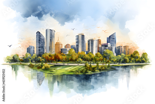 Fototapeta premium Beautiful cityscape with skyscraper and tree with reflect from the river. Watercolor illustration background