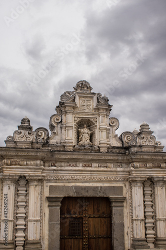 Naklejka premium beautiful classic colonial architecture style building facade with wooden door and dark gray sky