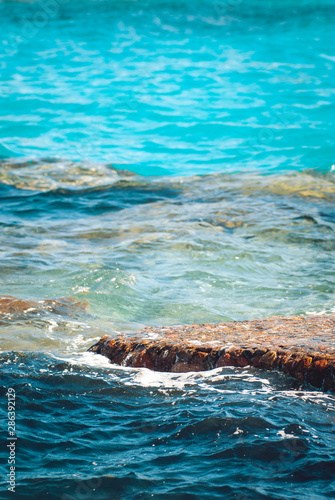Obraz premium Beautiful clear turquoise sea ocean water surface with ripples and bright splash on stone seascape background, horizontal picture