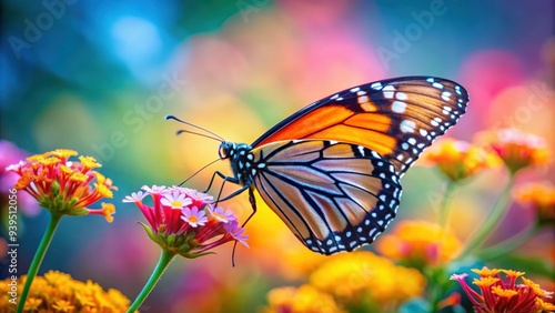 Fototapeta premium Beautiful close-up photo of a colorful butterfly resting on a flower, nature,...