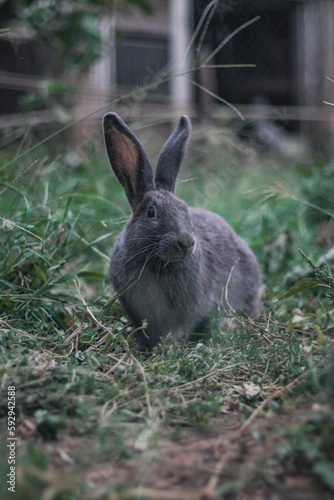 Fototapeta premium Beautiful closeup of a gray rabbit in the garden