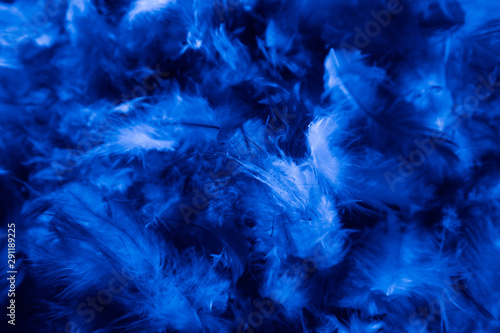 © Weerayuth, Obraz premium Beautiful closeup textures abstract colorful dark black white and blue feathers and darkness pattern feather wallpaper and background