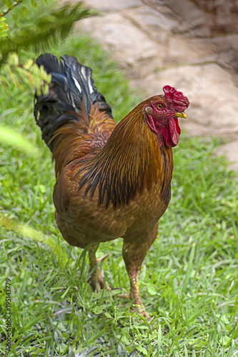 © A, Fototapeta premium Beautiful cock classic coloring on a background of green grass