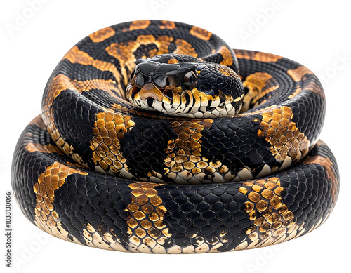 © Erni, Obraz premium Beautiful coiled black & gold patterned snake, dark background