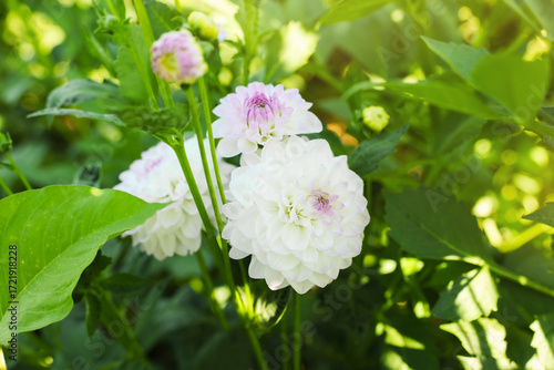© New Africa, Fototapeta premium Beautiful color dahlia flowers with green leaves growing outdoors