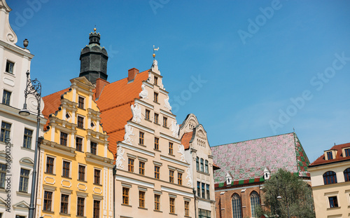 © mdyn, Fototapeta premium Beautiful colorful facades of antique building at Wroclaw, Poland. Polish landmark in the historic center of town. Clear blue sky