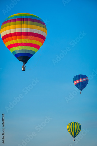 Fototapeta premium Beautiful colorful hot air balloon flying on the clear blue sky background.