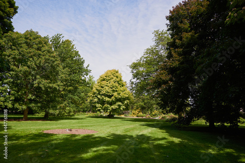 © Mikhail, Naklejka premium Beautiful colorful summer spring natural landscape with a lake in Park surrounded by green foliage of trees in sunlight and stone path in foreground.