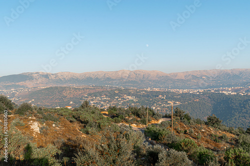 Fototapeta premium Beautiful colorful sunset over the mountain range and pine tree forest. Nature landscape. fogy sky with some orange reflections.