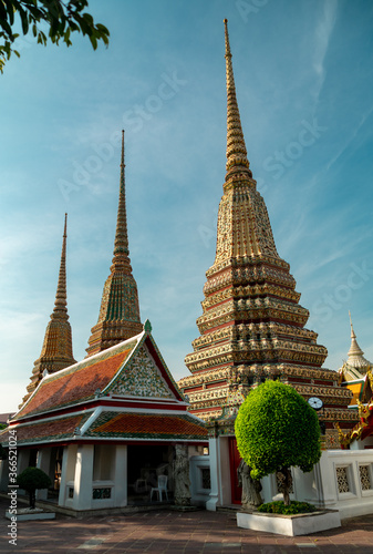 Naklejka premium Beautiful colorful temple in bangkok with bonsai, sunlight, Wat Pho