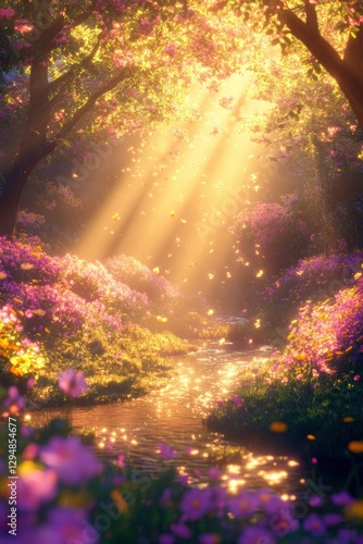 © Joyce, Naklejka premium Beautiful colorful wild flowers in deep foggy forest with sun light in Spring.