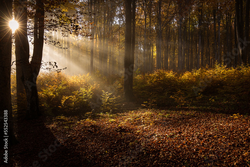 © danmir12, Fototapeta premium Beautiful colourful landscape in autumn season with rays of light in. forest. Romania