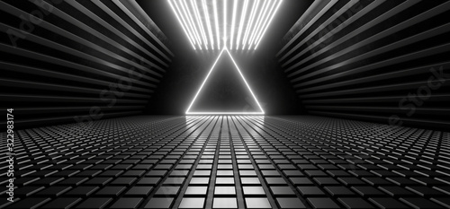 © Andrey Shtepa, Obraz premium Beautiful composition of white neon lights on a black background. 3d rendering image.