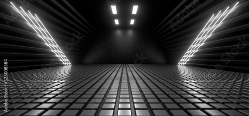 © Andrey Shtepa, Obraz premium Beautiful composition of white neon lights on a black background. 3d rendering image.