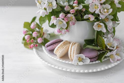 Fototapeta premium Beautiful composition with delicious French macarons and spring flowers in a white cup. Sweet dessert, early spring white and pink flowers, wedding decor, bride morning