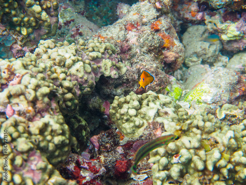 Fototapeta premium 美しいサンゴと可愛いコガネヤッコ(キンチャクダイ科)の幼魚他。日本国静岡県伊豆半島賀茂郡南伊豆町中木から渡し船で渡るヒリゾ浜にて。 2022年10月水中撮影。Beautiful corals and lovely juvenile Lemonpeel Angelfish (Centropyge flavissima) and others.