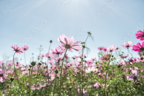 Fototapeta premium Beautiful cosmos flowers blooming in garden with sun. Nature background.
