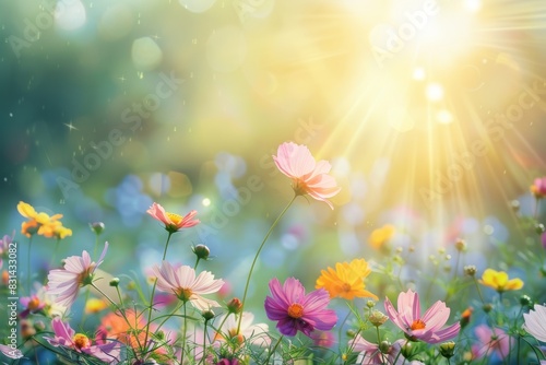 Obraz premium Beautiful cosmos flowers in the meadow, sunlight and blue sky background, a beautiful natural landscape with a summer flower field, colorful wildflowers in the green grass at sunrise or sunset.