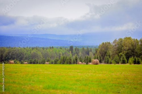 Fototapeta premium Beautiful countryside landscape. Round straw bales in harvested fields and...