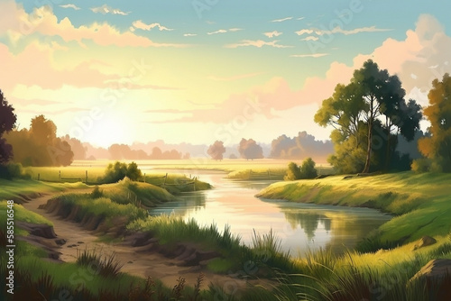 © Rainbow Spells, Obraz premium Beautiful countryside landscape. Simple flat cartoon illustration created with generative ai technology