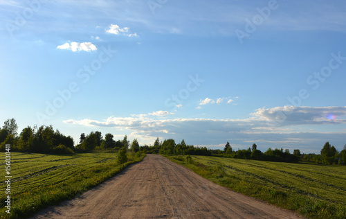 Obraz premium Beautiful countryside rural evening landscape: a sandy road between fields...