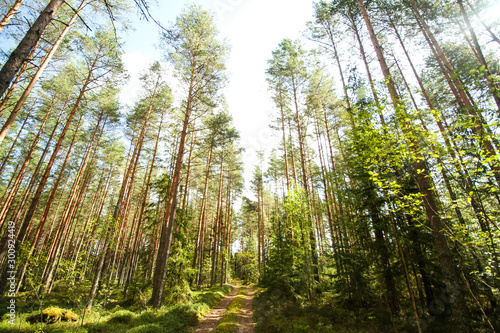 Naklejka premium Beautiful countryside view of old forest in Europe-Latvia. Natural forest in a hot, sunny summer day with bright blue sky with clouds.