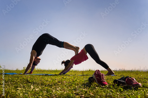 © illustrissima, Fototapeta premium beautiful couple doing acro yoga on the beach