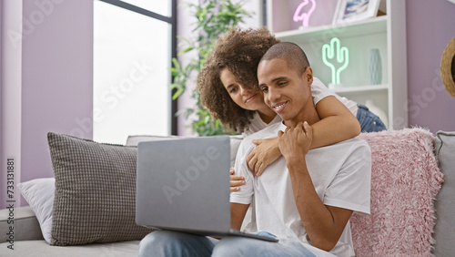 Naklejka premium Beautiful couple enjoying a fun, joyful time kissing and working on a laptop while sitting together on a casual sofa at home, their confident smiles reflecting love, positivity and a happy lifestyle.
