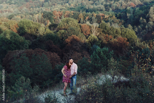© syrotkin, Fototapeta premium Beautiful couple, husband & wife posing & hugging in forest, lan