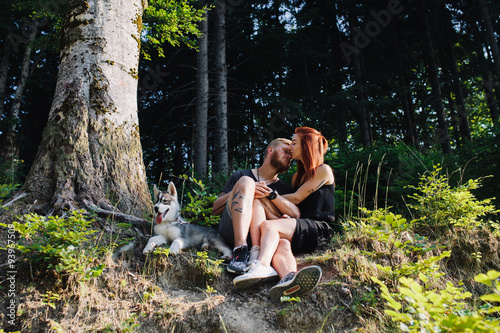 Naklejka premium beautiful couple sitting in a forest near the tree