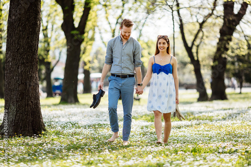 © NDABCREATIVITY, Fototapeta premium Beautiful couple taking a walk in city park