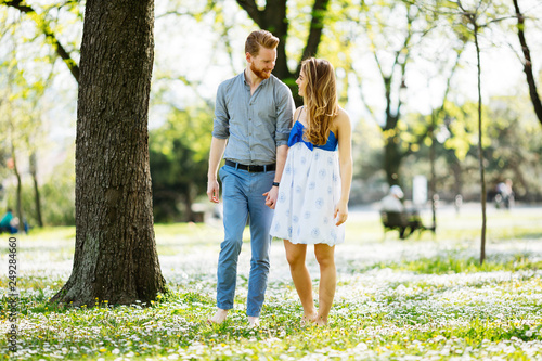 © NDABCREATIVITY, Fototapeta premium Beautiful couple taking a walk in city park