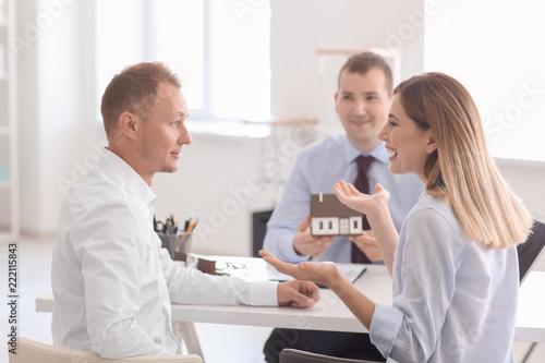Obraz premium Beautiful couple with real estate agent in office