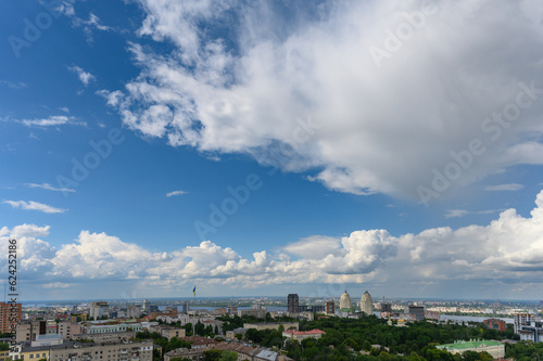 Fototapeta premium Beautiful cumulus clouds in the blue sky over the city.
