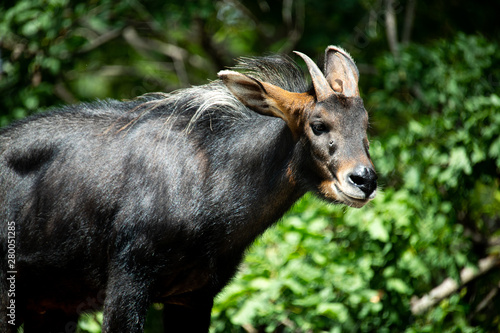 © Jack Tamrong, Fototapeta premium Beautiful curious Chamios stand on rock and look around among green trees background on hot summer day.