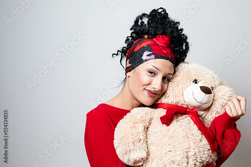 Fototapeta premium Beautiful curly young girl with bandana hairstyle holding teddy bear