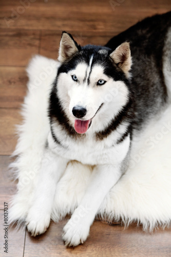 Fototapeta premium Beautiful cute husky lying on carpet in room