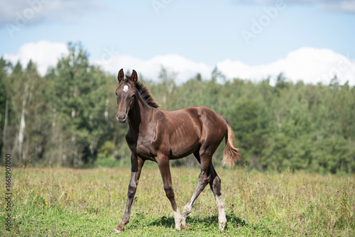 Fototapeta premium beautiful dark chestnut sportive foal walking at pasture. cloudy summer day